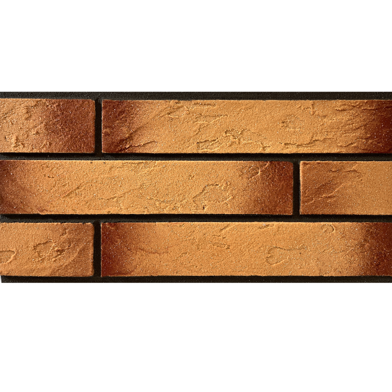 Model IO176 to elastyczna płytka elewacyjna o nieregularnej, łupkowej fakturze, która świetnie imituje naturalny kamień. Żółtawo-brązowa tonacja, wzbogacona o subtelne cieniowania i przejścia tonalne, nadaje jej dynamiczny, ale przy tym ciepły wygląd.